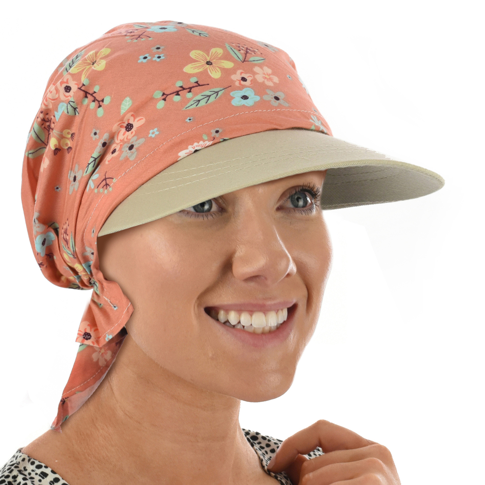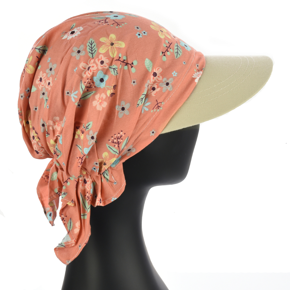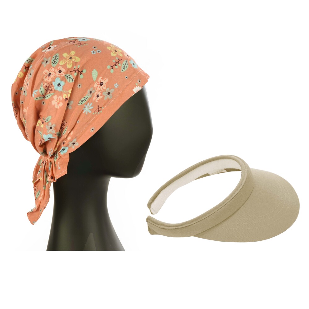 Chemo Head Wrap Scarf & Visor Set | Beige Visor & Orange Apricot Floral Headwrap | XS/S