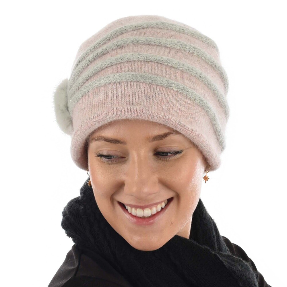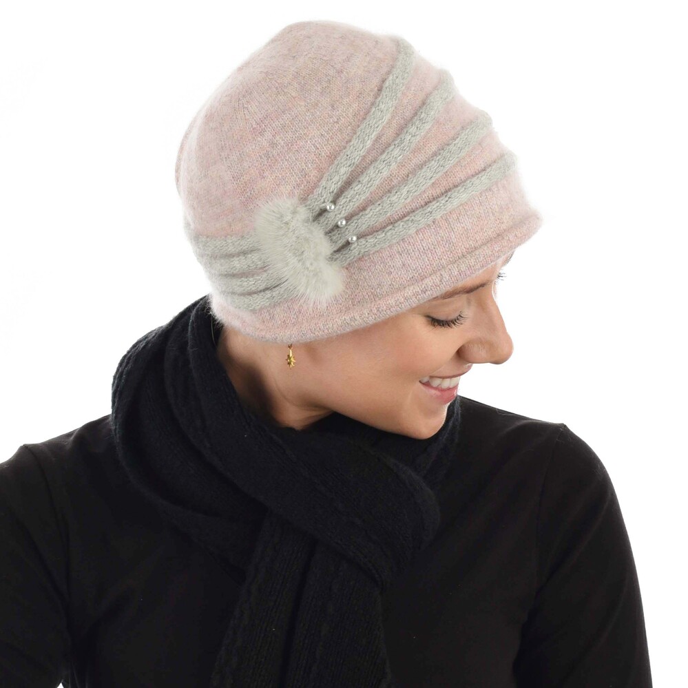 The Angora Retro Cloche – Patricia is knitted with two-toned yarn. It features 4 knitted ribs around the crown, and it is elegantly embellished with handsewn pearls and fur. This great retro fashion inspired bell-shaped cloche hat is an excellent example of colou