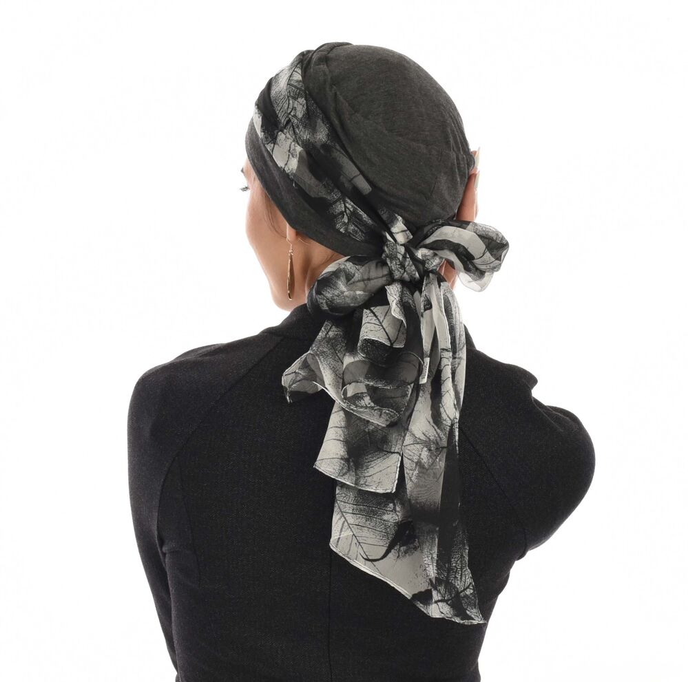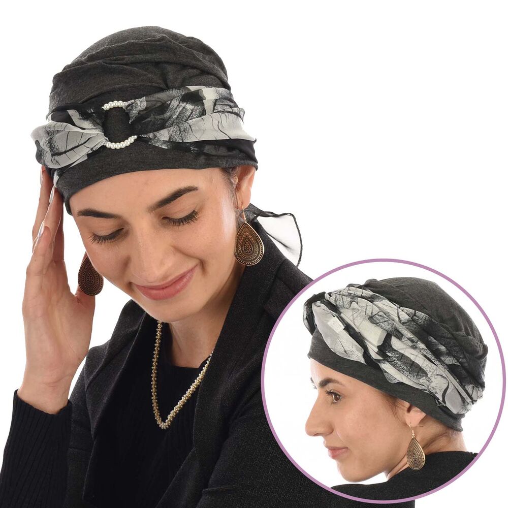 Bamboo Turban with Pearl Ring & Sash Set | Dark Grey & Leaf Sketch Print Scarf