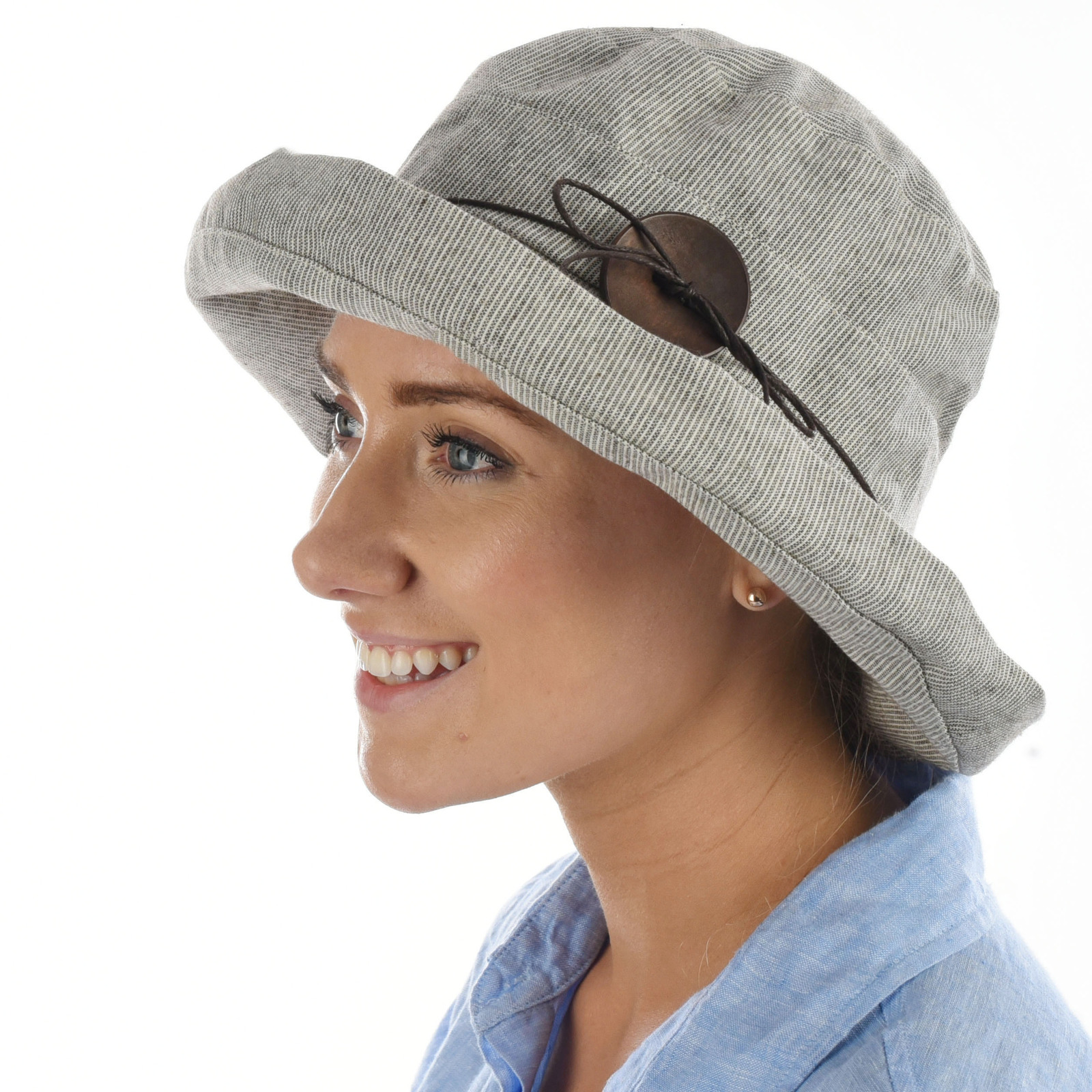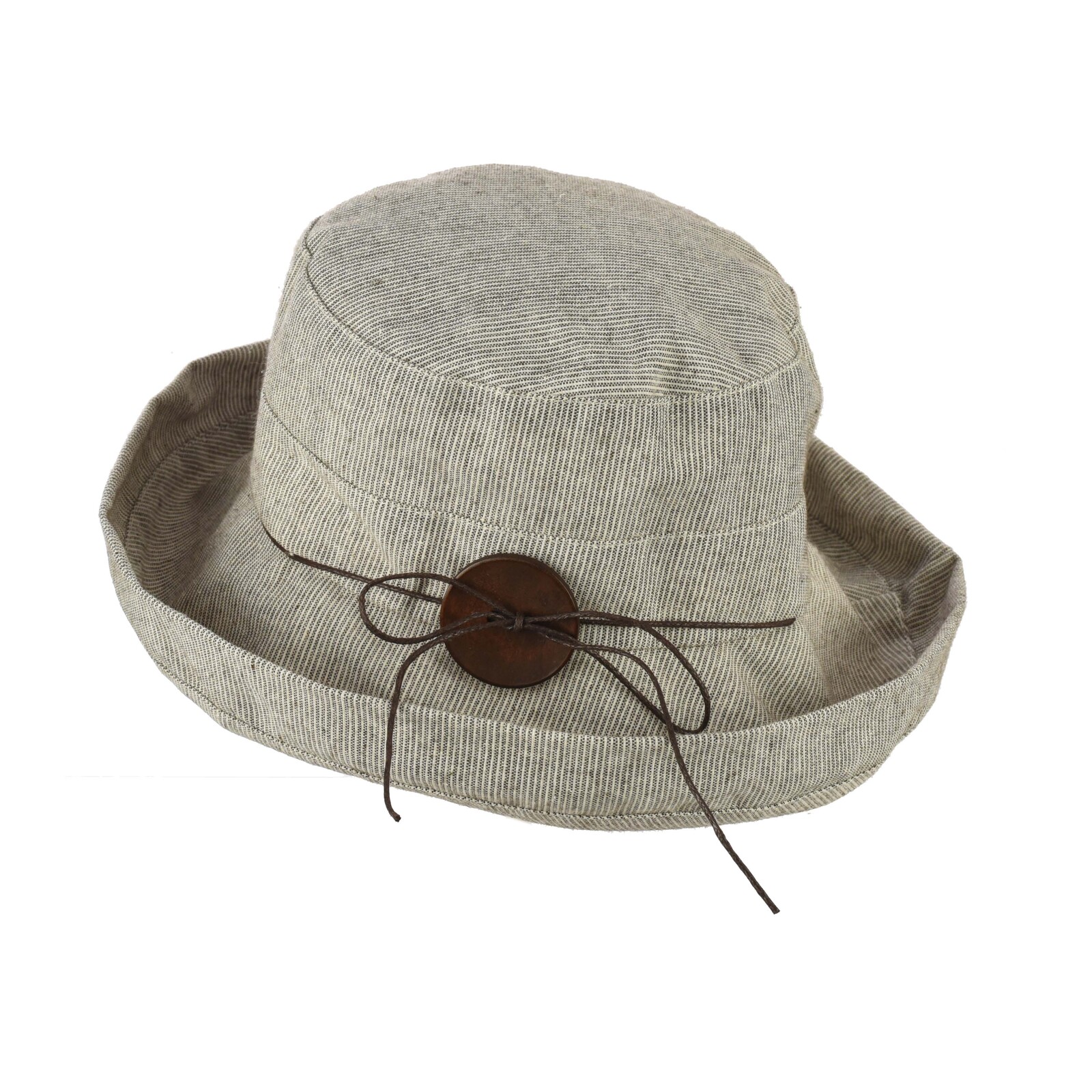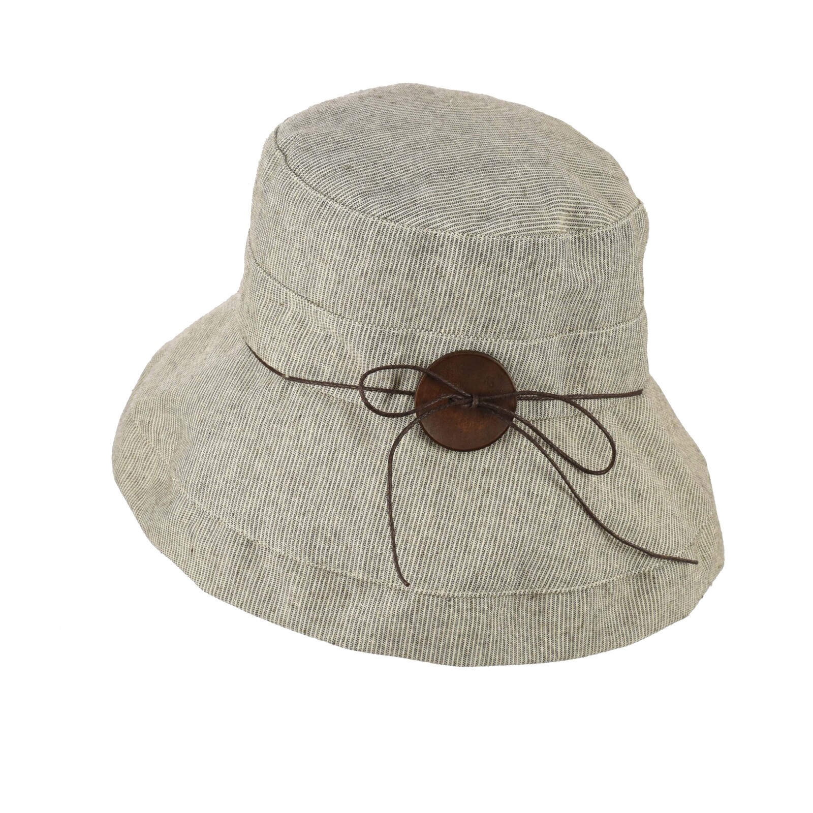 Big Button Linen Bucket Hat | Light Grey with fine stripes