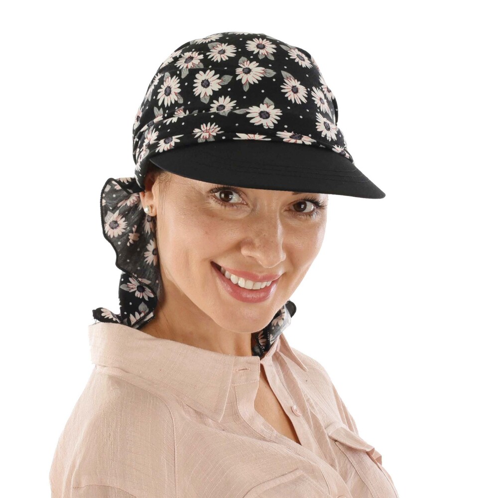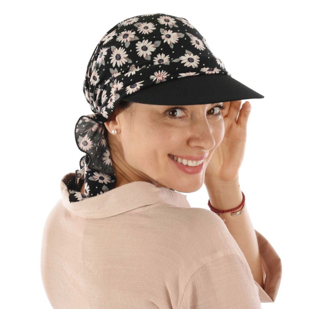 Chemo Head Wrap Scarf & Visor Set | Black Visor & Stretchable Floral Headwrap | S/M/L