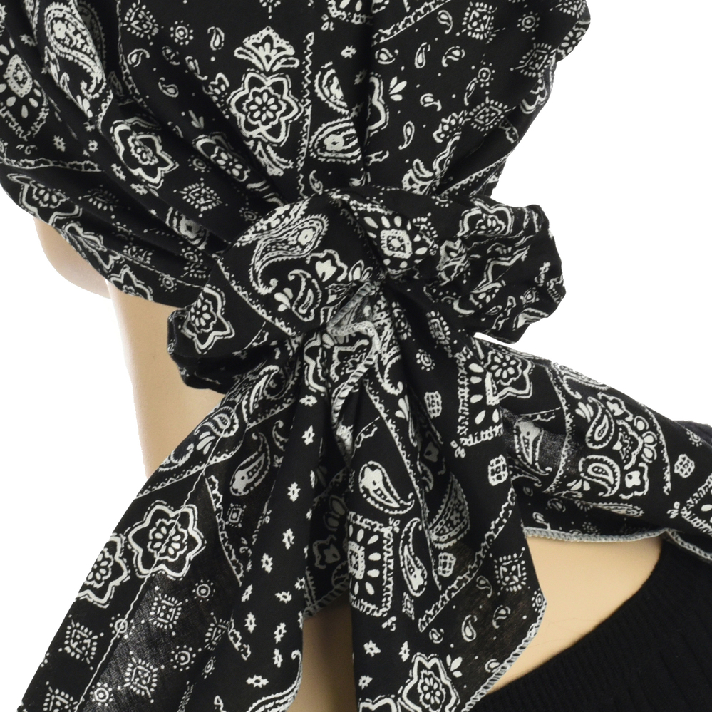 The paisley print cotton bandana can be worn separately, but the scrunchie elevates the style options to a different level and makes scarf tying effortless.