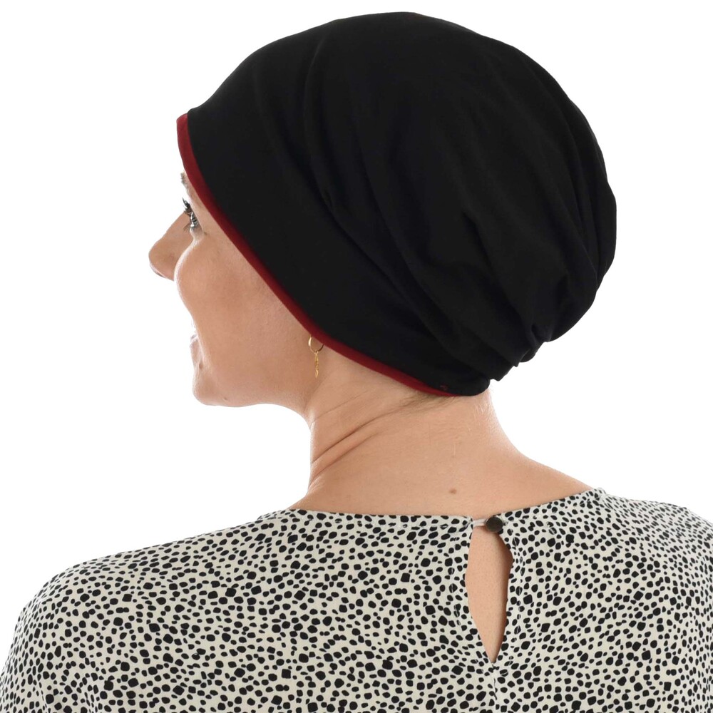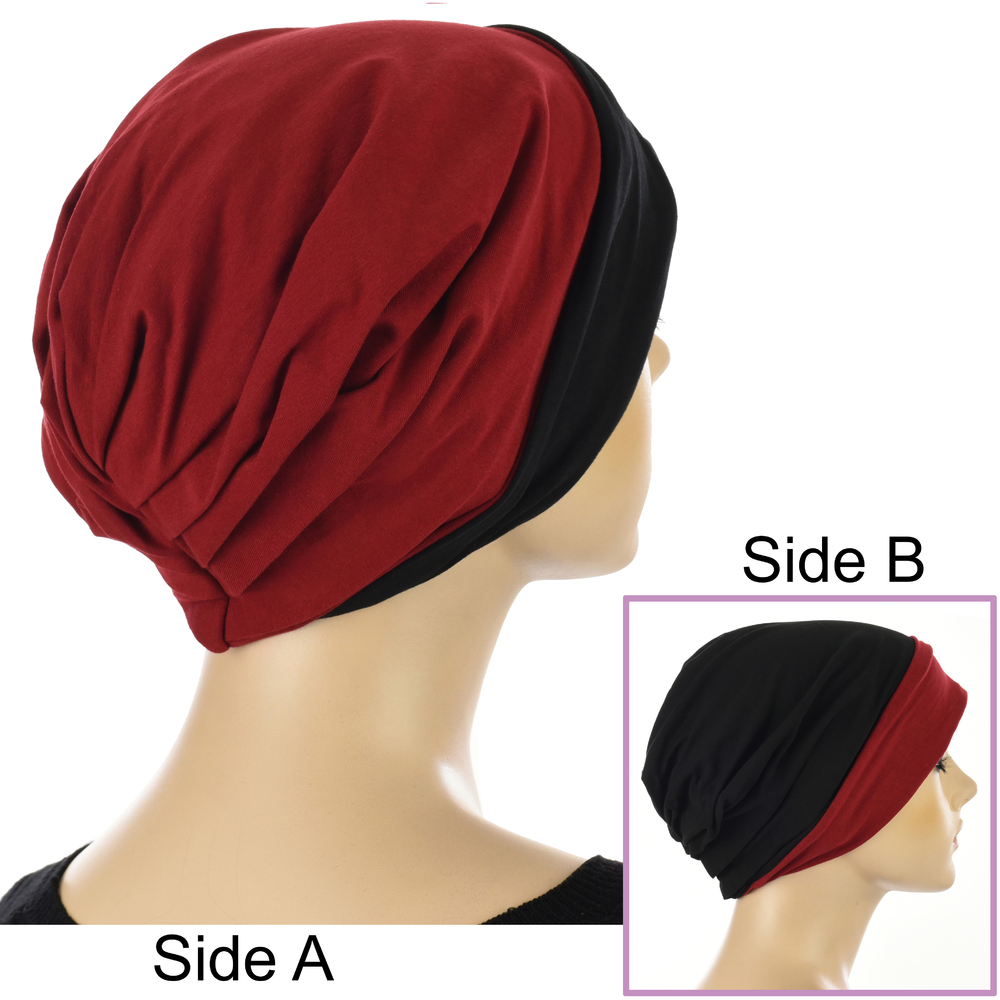 The Double-sided Two-toned Headcover – Ingrid is made of our premium jersey cotton material, which has 95% cotton and 5% spandex. It is not only soft, stretchy, but also breathable. It is an ideal hat for those who lost the hair due to chemotherapy treatments or alopecia. We recommend the Double-sided Two-toned Headcover – Ingrid for cooler weather.