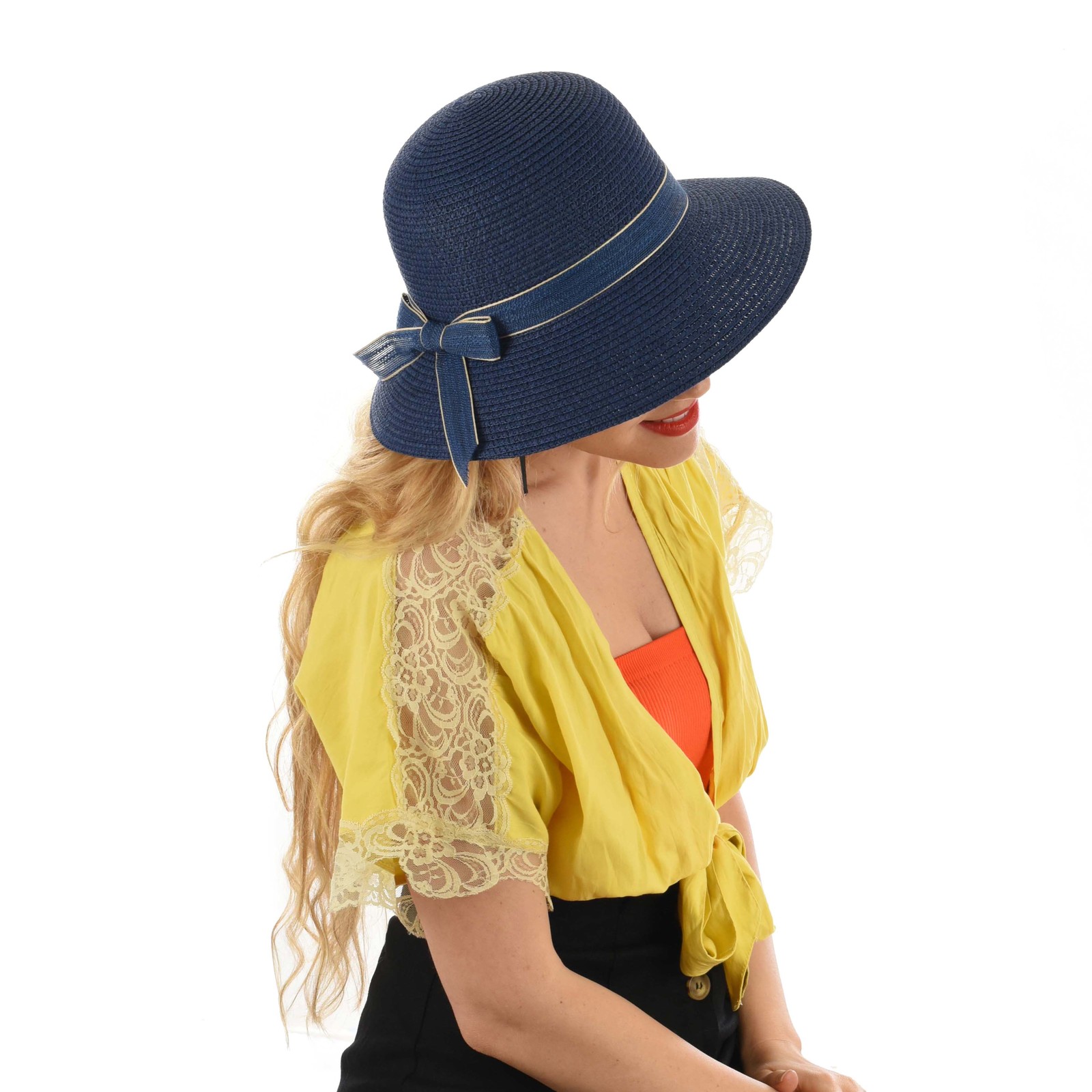 The colour co-ordinated lace band around the crown and the ribbon bow on the side bring a pop to the hat. You may like to wear the ribbon either on the side or back of the head, or even at the front.