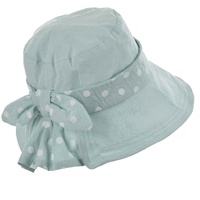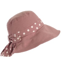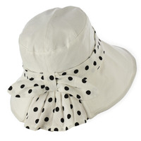 It features a band around the crown, a bow and a pleated back, all made of matching coloured fabric with white polka dots.