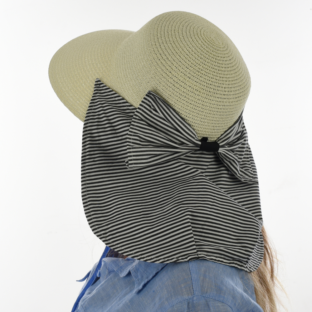 Stay stylish and sun-protected with our Garden Hat with Striped Convertible Neck Cover. With its wide brim and 360-degree sun protection, this hat provides the ultimate shield from harmful UV rays. The striped cotton blend neck cover adds an extra layer of sun protection and can be easily converted to a big bow when the neck cover is unnecessary.