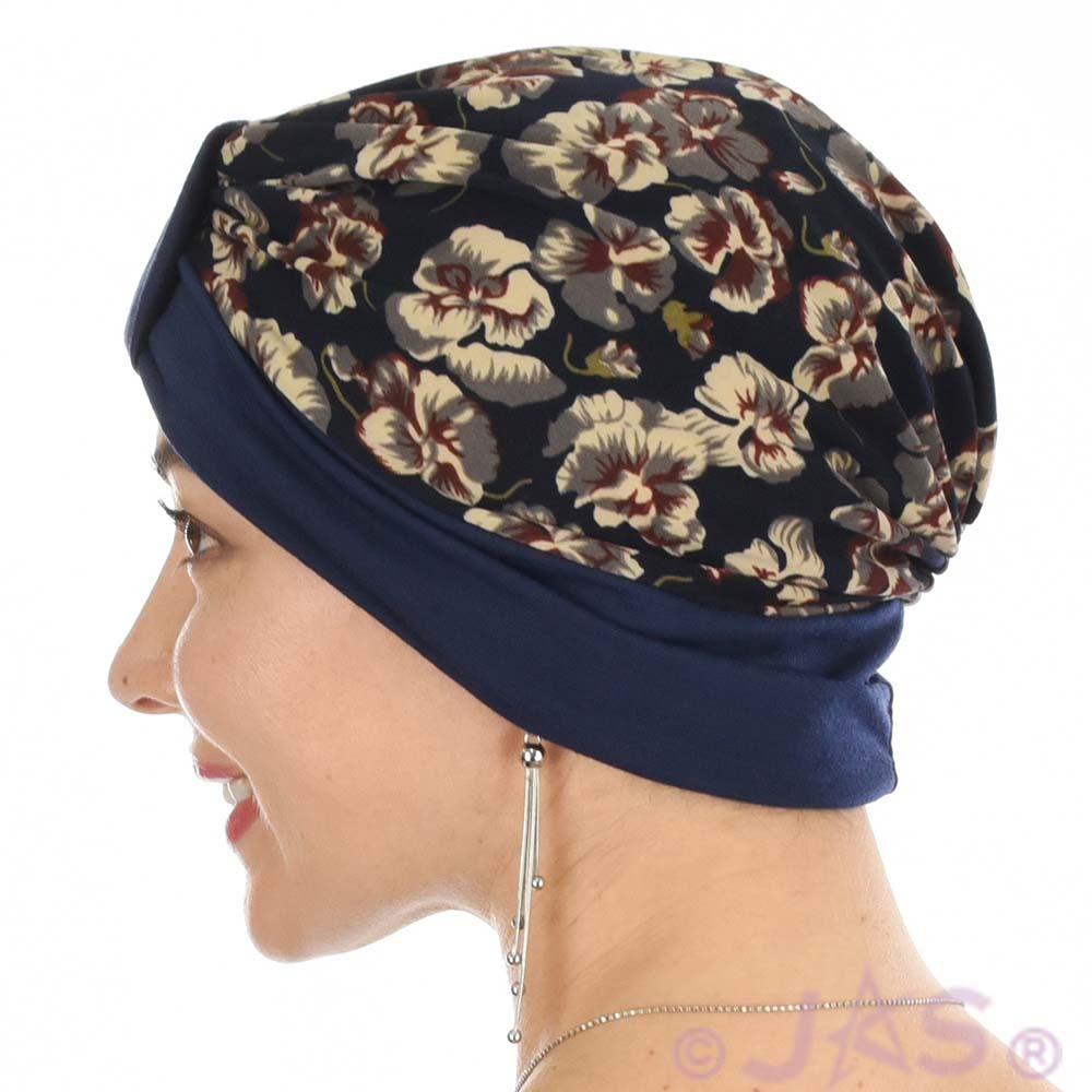 The Headband Turban Rosie is made of modal fabric - soft and comfortable. The main section of the turban is constructed with floral print fabric. The Headband Turban Rosie features a band around the crown area. The band around the crown is constructed with solid coloured fabric. The band lifts the look of the turban through colour co-ordination and colour contrast.