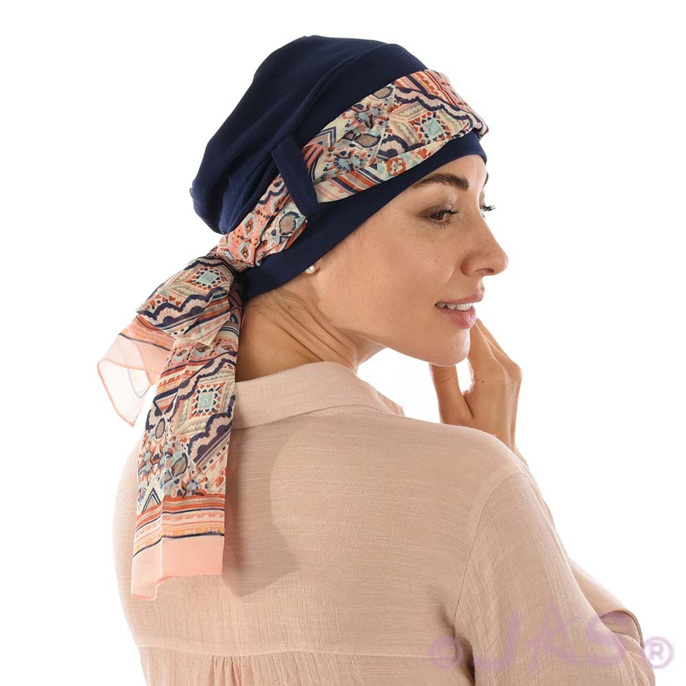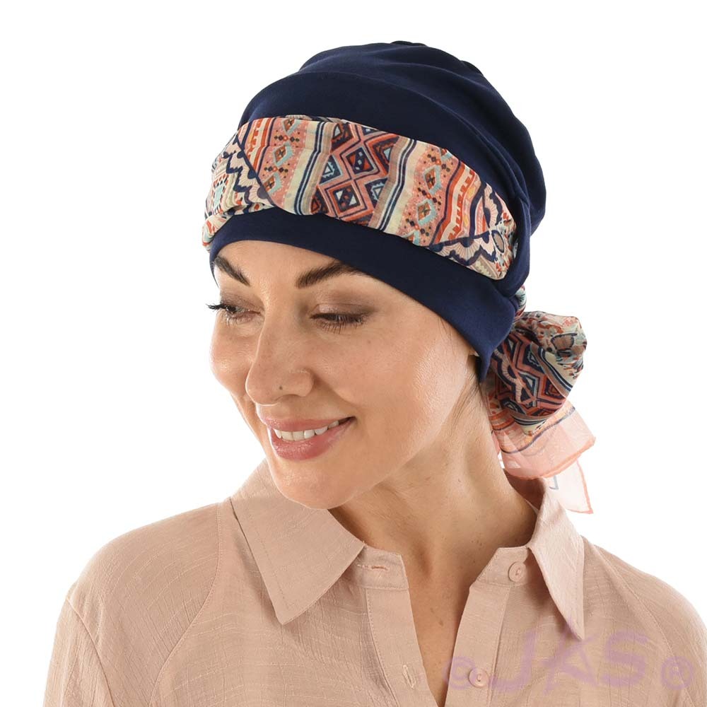 The Jersey Turban Katelyn can sit on any head size from XXS to XXL nicely and comfortably by adjusting the scarf.