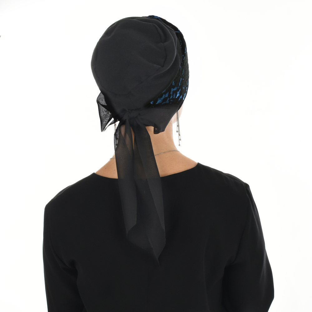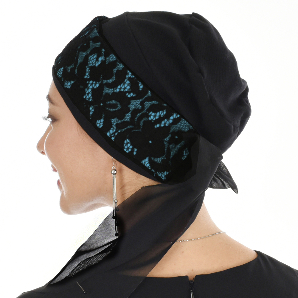 A black turban with a black overlay lace with the following cotton band base: