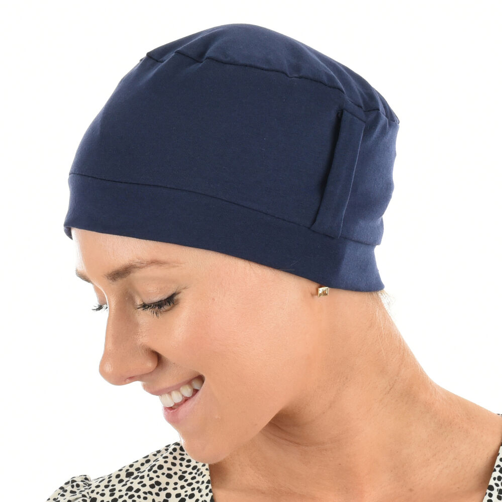 The Looped Cotton Turban – Denise is made of double layers of soft cotton material (95% cotton and 5% spandex). The Looped Cotton Turban – Denise has no harsh seams to irritate tender scalps. It is a great hat for people with sensitive scalps due to thinning hair or hair loss caused by medical conditions such as chemotherapy or alopecia.