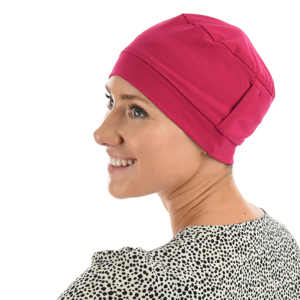 The Looped Cotton Turban – Denise is made of double layers of soft cotton material (95% cotton and 5% spandex). The Looped Cotton Turban – Denise has no harsh seams to irritate tender scalps. It is a great hat for people with sensitive scalps due to thinning hair or hair loss caused by medical conditions such as chemotherapy or alopecia.
