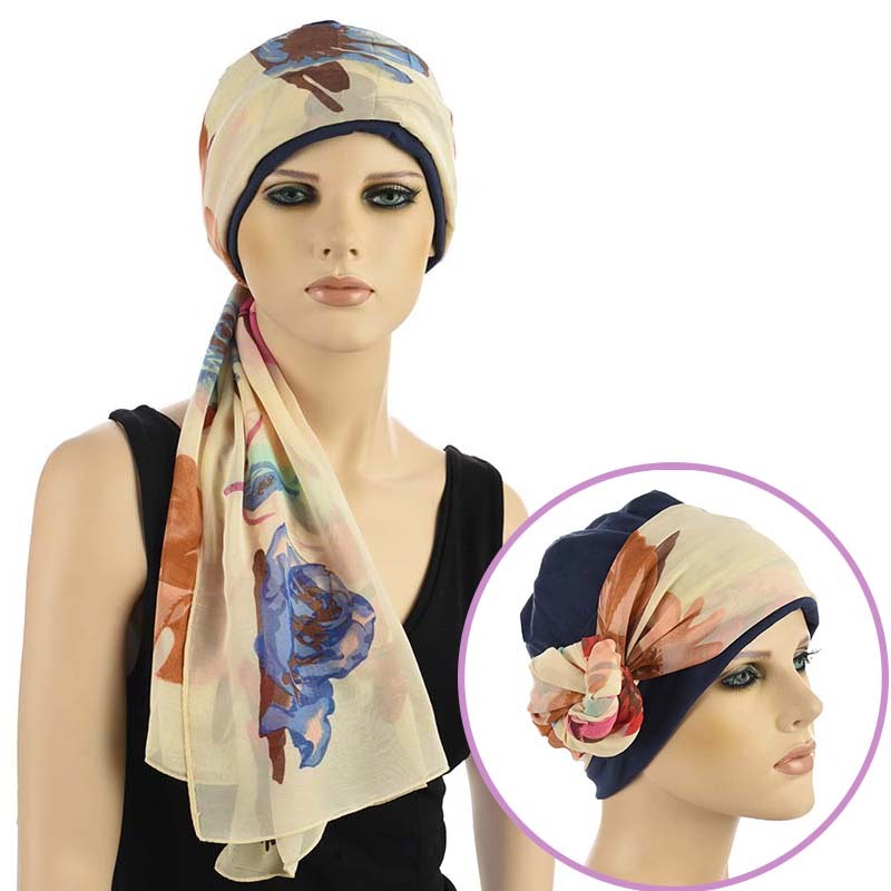 The Cotton Chemo Hat with Scarf Band set combines the benefits of two good items and allows you more styling versatility. They can be worn together to create styling versatility and fashion intricacy through colour contrast and coordination. The beautiful silky scarf band with floral print adds a pop of colour to the solid coloured beanie hat.