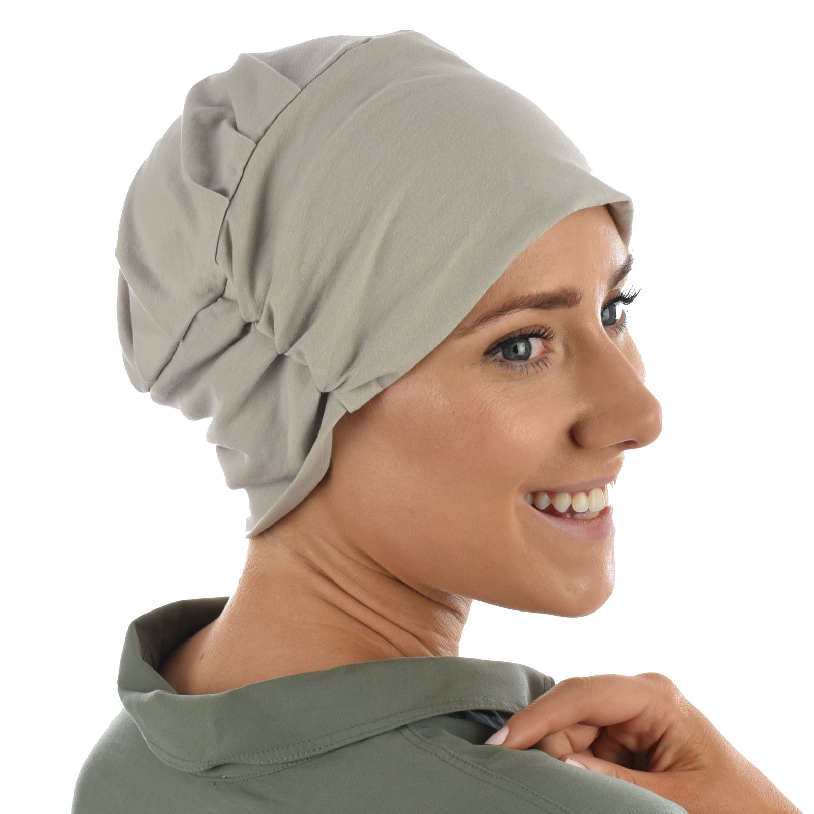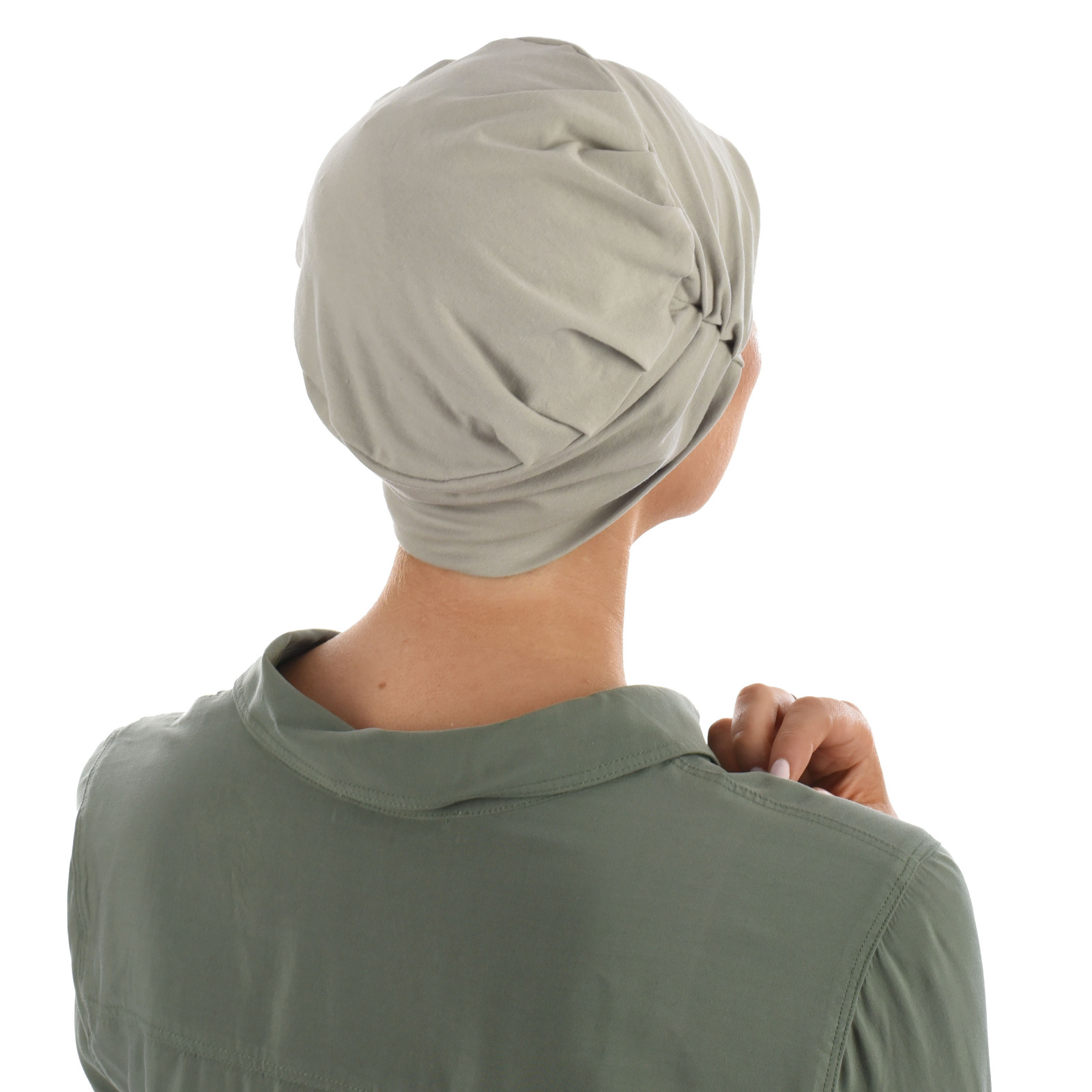 The REBECCA COTTON Beanie Turban features a gathering on the top of the hat, which adds increased volume on top of your head. It has another gathering on the side of the hat, which brings versatility for styling. The side gathering can be worn at the front for a turban look; the gathering can be worn on the side of your head for a feminine look; the gathering can be worn at the back of the head for a simple and sleek look.