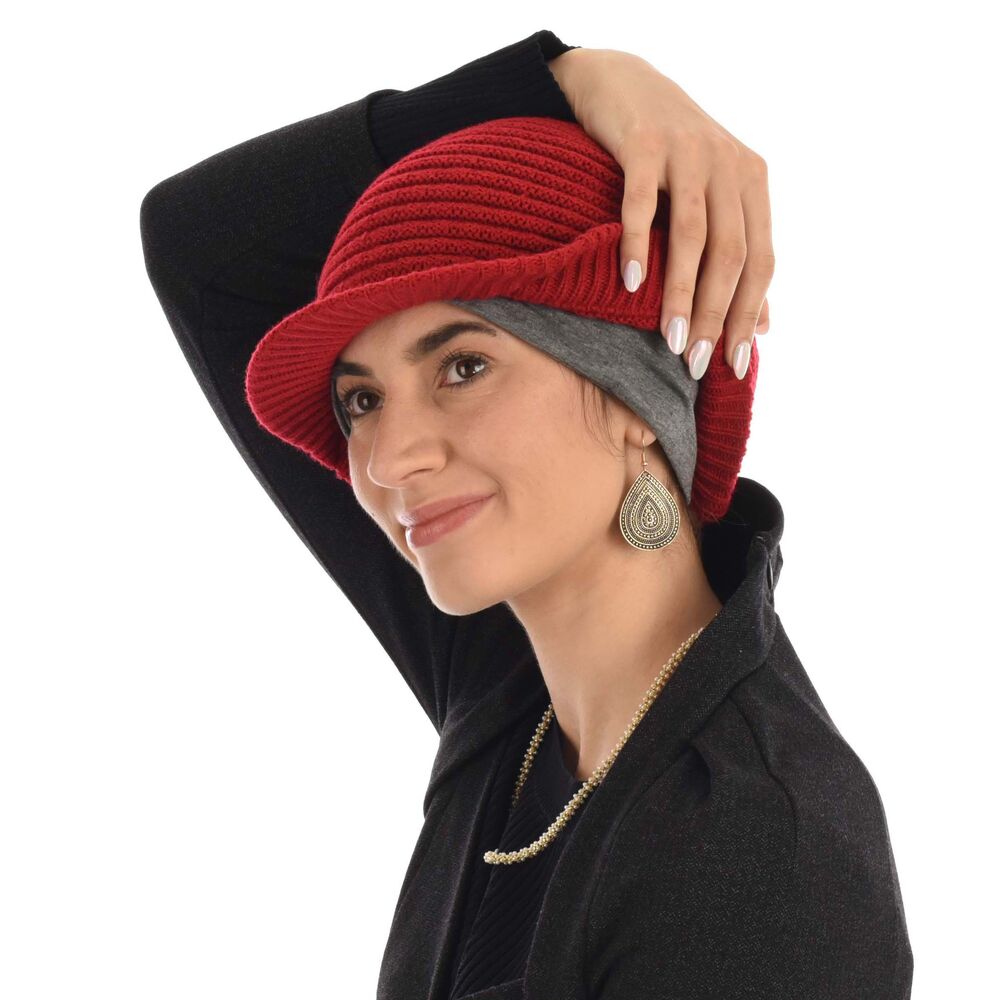 Ribbed Slouchy Beanie Cap with Swirly Jersey Beanie Liner | Red with Grey Liner