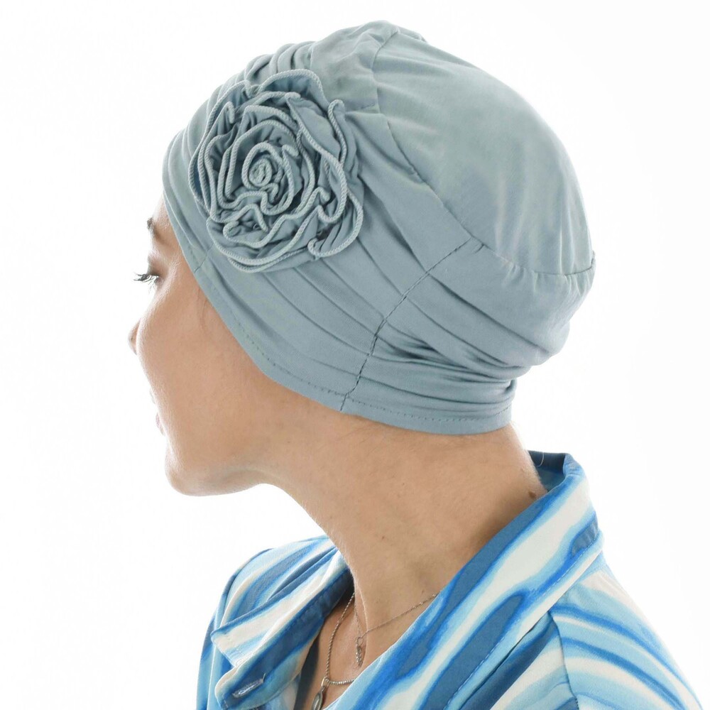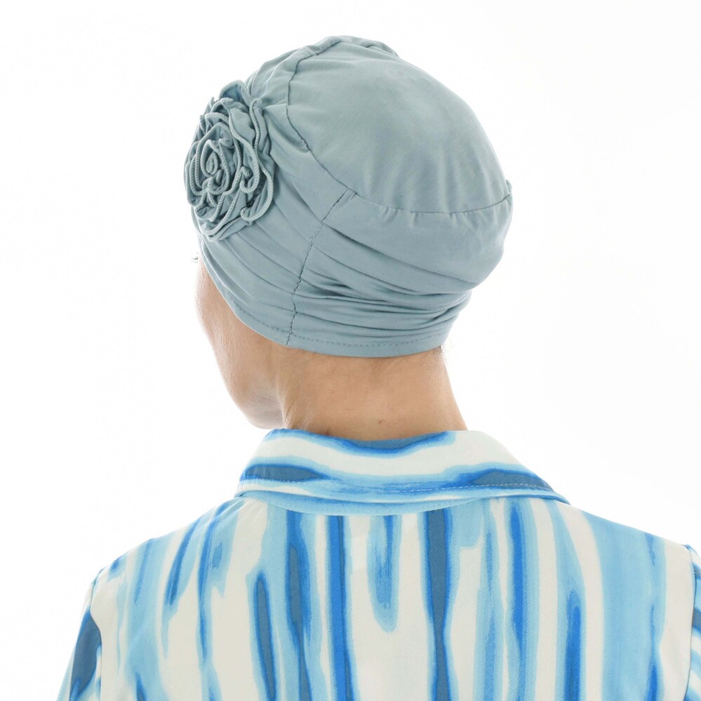 As this turban hat is made of the most desired chemo fabric – bamboo, the volume of the hat doesn’t compromise the comfort of the hat. The Rosette Ruched Turban – Hannah is soft and stretchy.