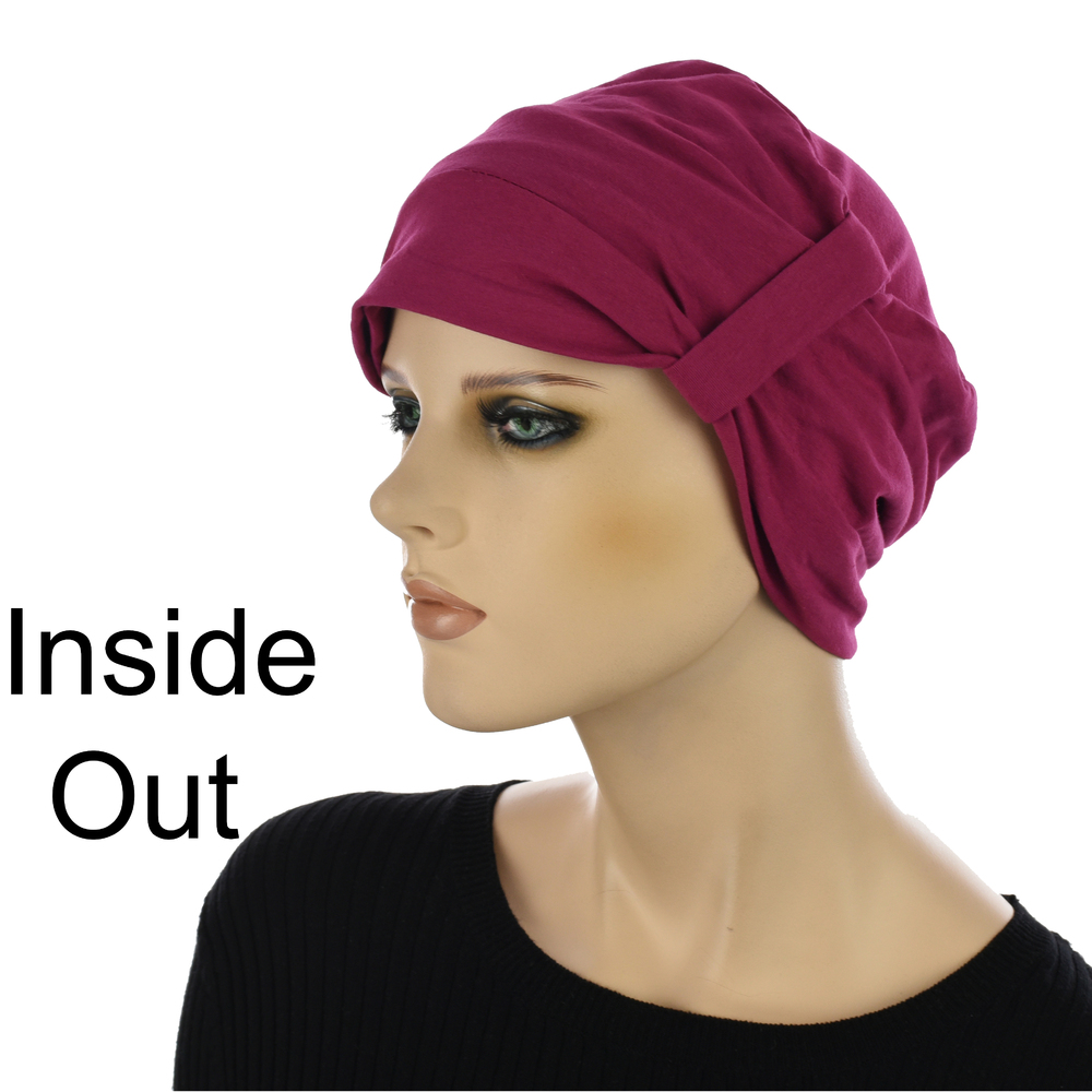 The Ruched Cotton Turban Beanie Hailey is double-layered with no visual seams inside. In fact, the Ruched Cotton Turban Beanie Hailey can be worn inside out. Please see some of the images. When the Ruched Cotton Turban Beanie Hailey, is worn inside out, it creates a very sleek look.