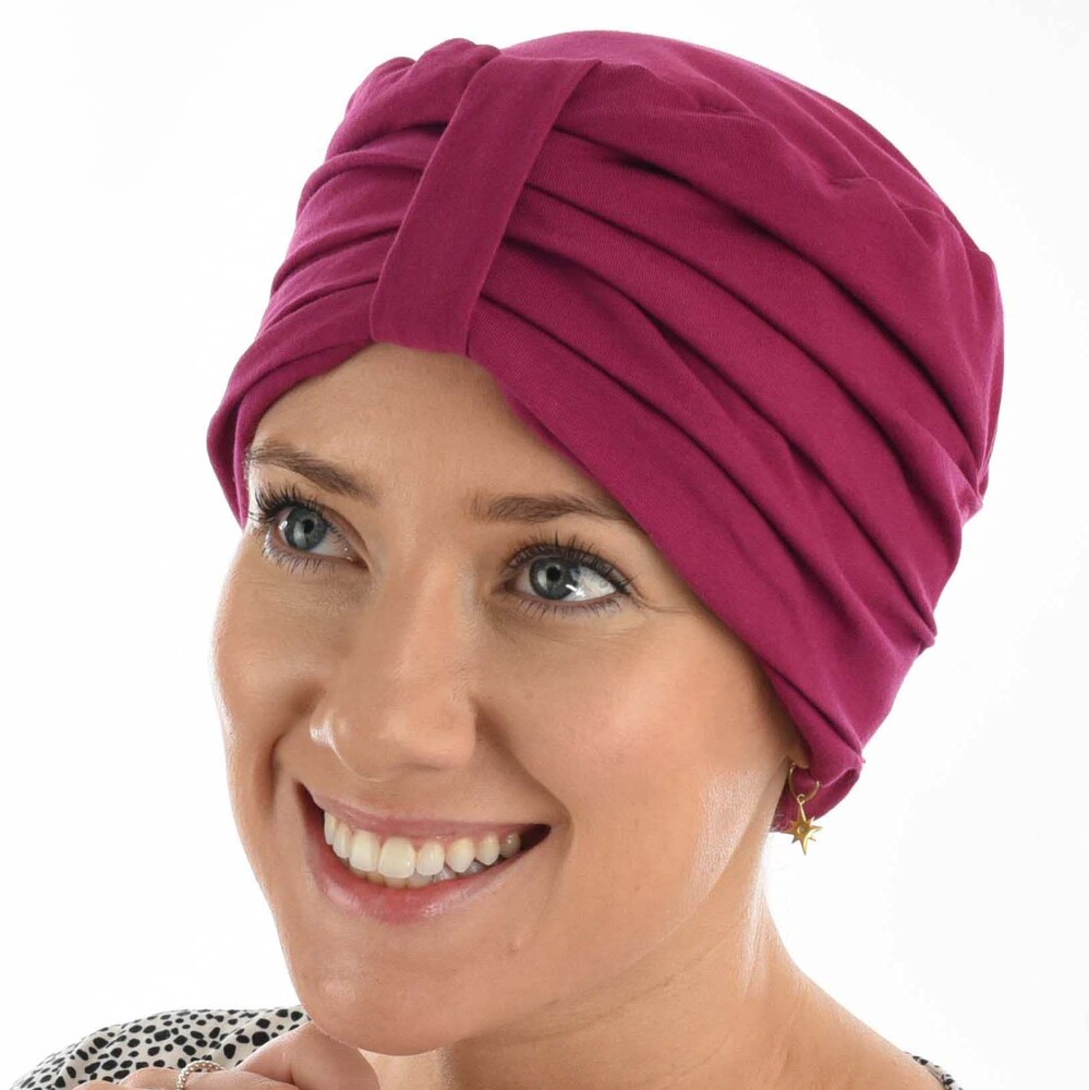 As a purposely made chemo headwear, the Ruched Cotton Turban Beanie Hailey is constructed with our premium jersey cotton fabric, and it is soft and gentle to bald scalps. The Ruched Cotton Turban Beanie Hailey fea
