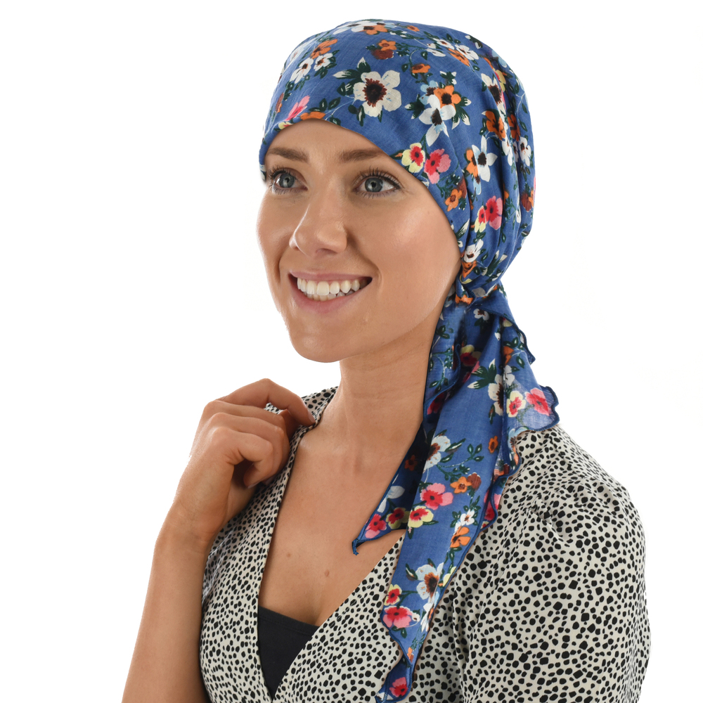 The Ruffled Floral Print Triangle Scarf is a great alternative to a chemo hat in warm seasons. Whether you are on the go seeking an easy and simple styling option or you would like to have fun with some creative and personalized styling options, the Ruffled Floral Print Triangle Scarf will suit your needs.
