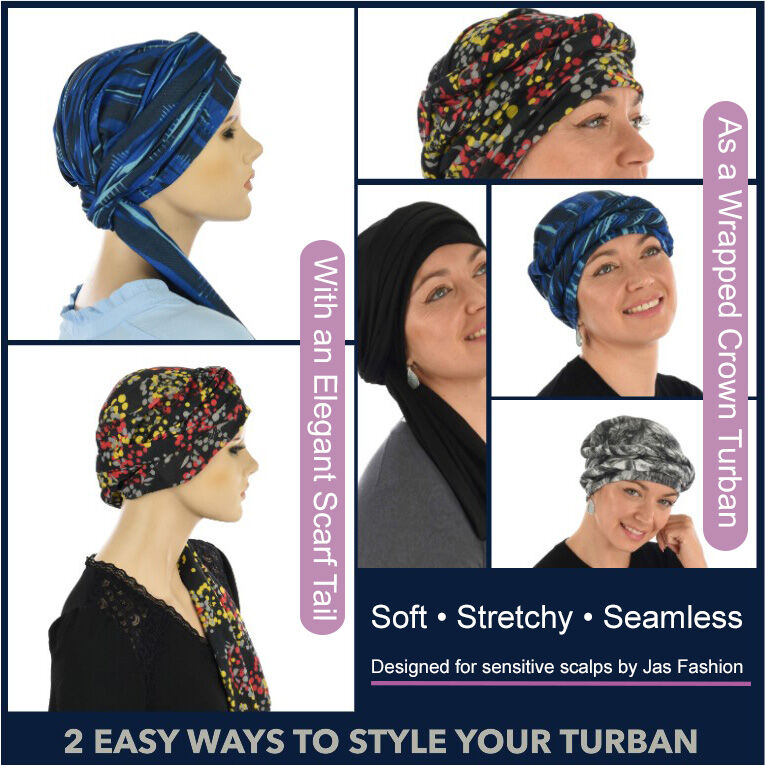 Unlike traditional headscarves that require folding and tying, this seamless tube simply slips on. The extended 144cm length allows you to wrap, twist and layer to create height and volume around the crown, making it ideal as a turban for hair loss, chemo headwear,