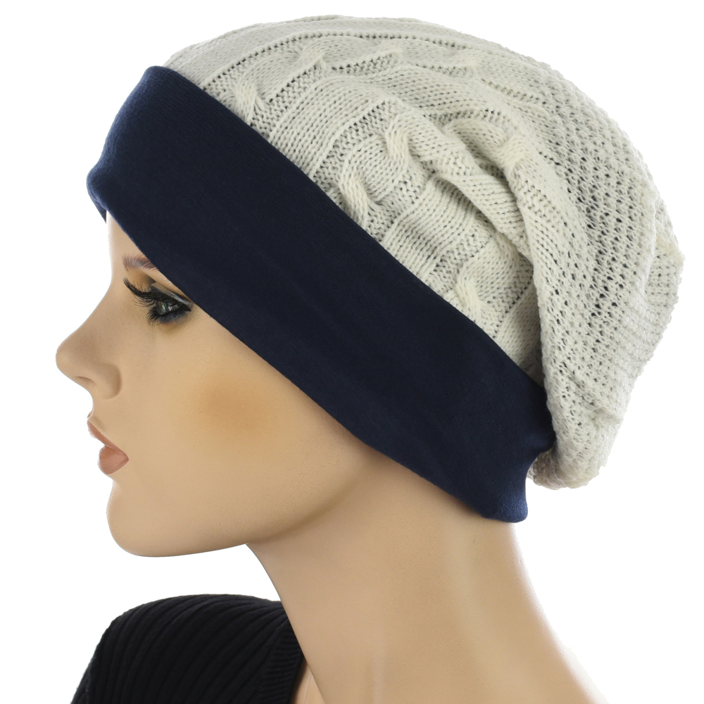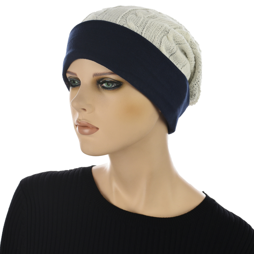 - Option 2: Cream White Beanie with Navy Blue Seamless Lining Wrap