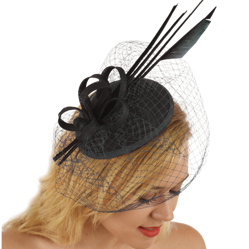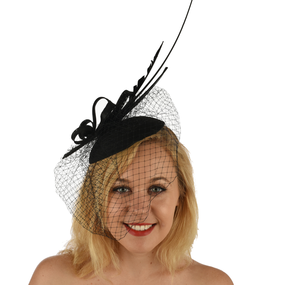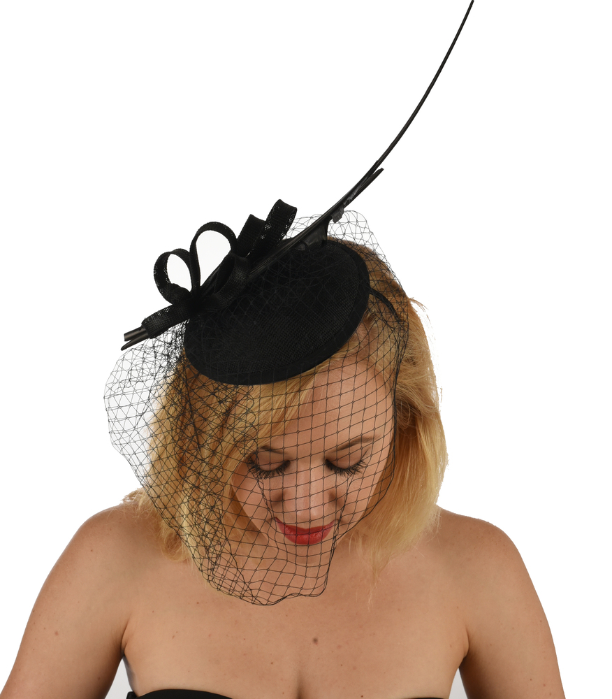Fascinator - Amanda with Feather Quills and Netting Veil | Black