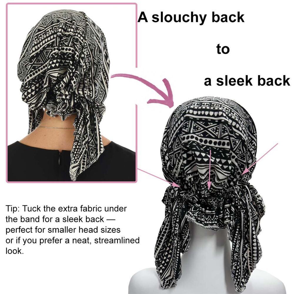 - This pre-tied headwrap scarf is made from a highly stretchy jersey knit material, allowing it to comfortably fit most head sizes, up to 60cm or even larger when fully stretched.