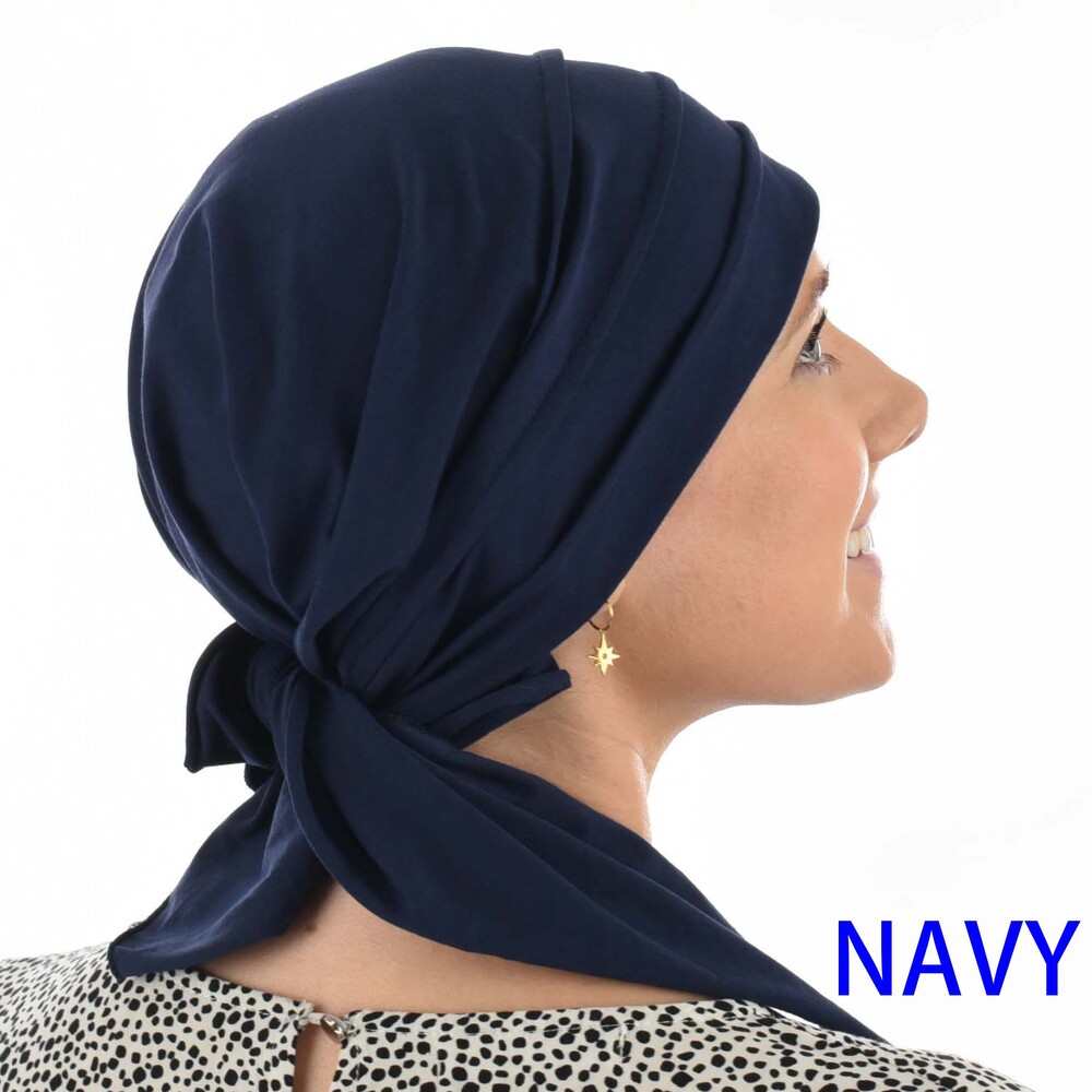 We recommend The Soft Pleated Triangle Scarf – Carly for all seasons and all head sizes.