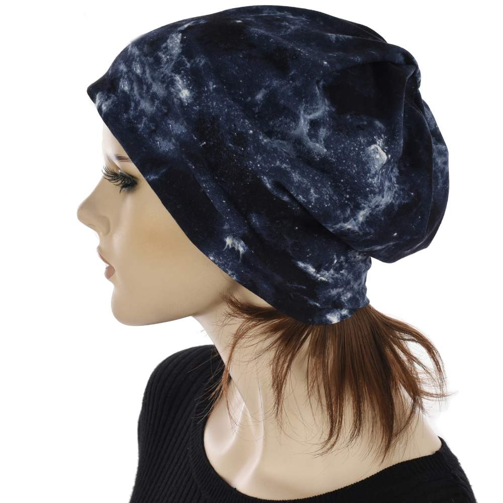 Tie-dye/galaxy blue beanie with short blond hair attached