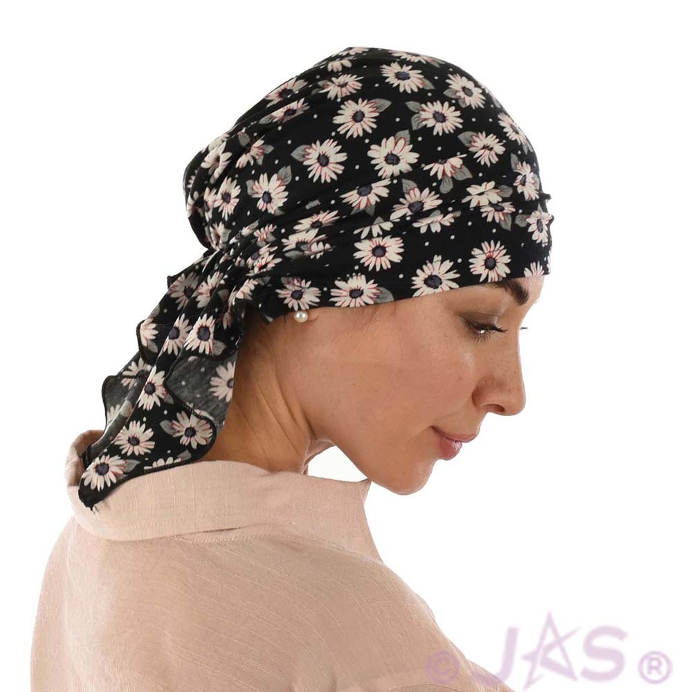 Stylish and easy to wear, the Stretch Floral Pre-tied Scarf Holly, is great for women with no hair or great on a bad hair day for those with hair.