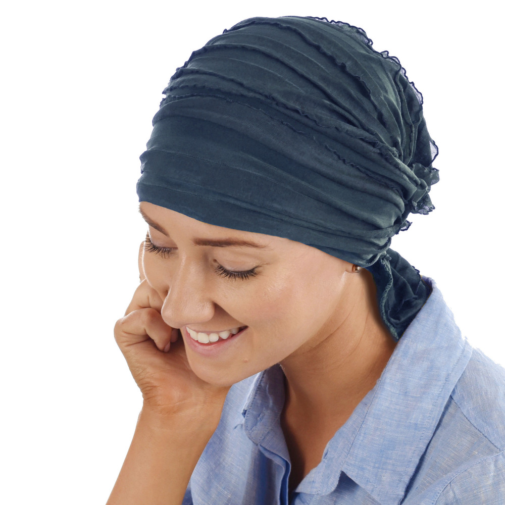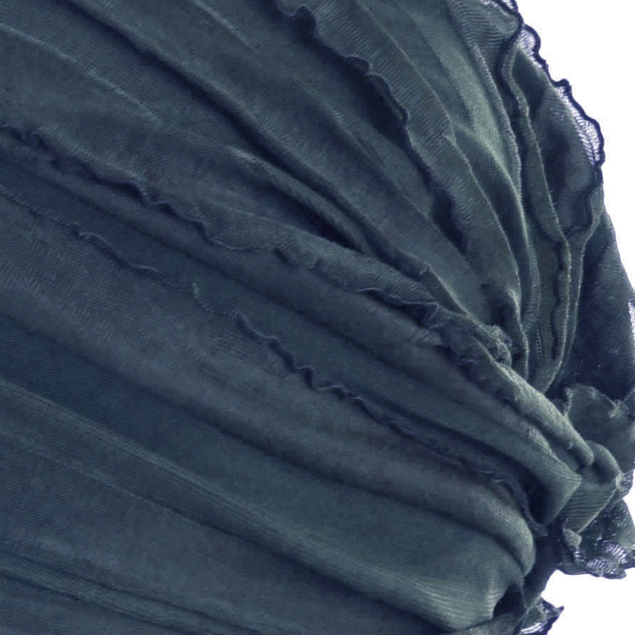 Stretch Layered Ruffle Scarf Wrap (Jenny) is constructed with a very soft and silky material. The material comes in two semi-opaque layers. The base layer is very smooth and stretchy. The top layer or the exterior layer is formed by ruffled cascading flaps, and it adds opaqueness, femininity and volume to the headcover, which is great for anyone suffering from hair loss due to cancer, chemotherapy, alopecia or other types of medical ha
