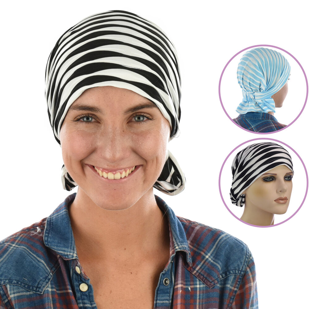 The two-toned fabric has a ruffled pattern on one side to create a look of fullness, and the interior side is so soft and smooth for sensitive scalps.