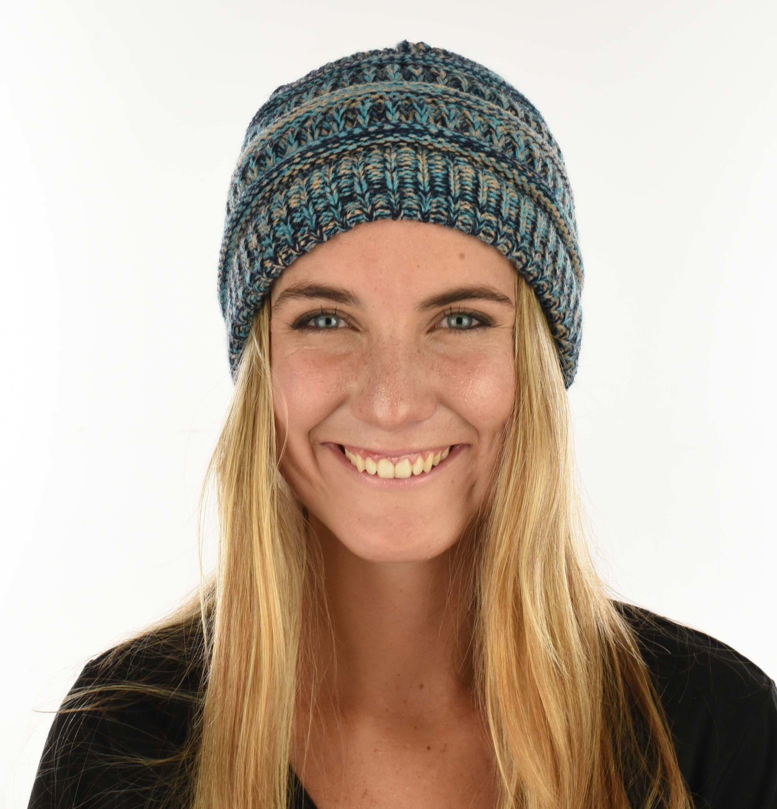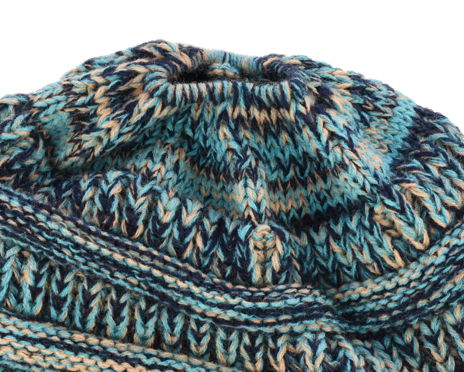 Three Toned Messy Bun Beanie | Turquoise Blue / Navy / Beige