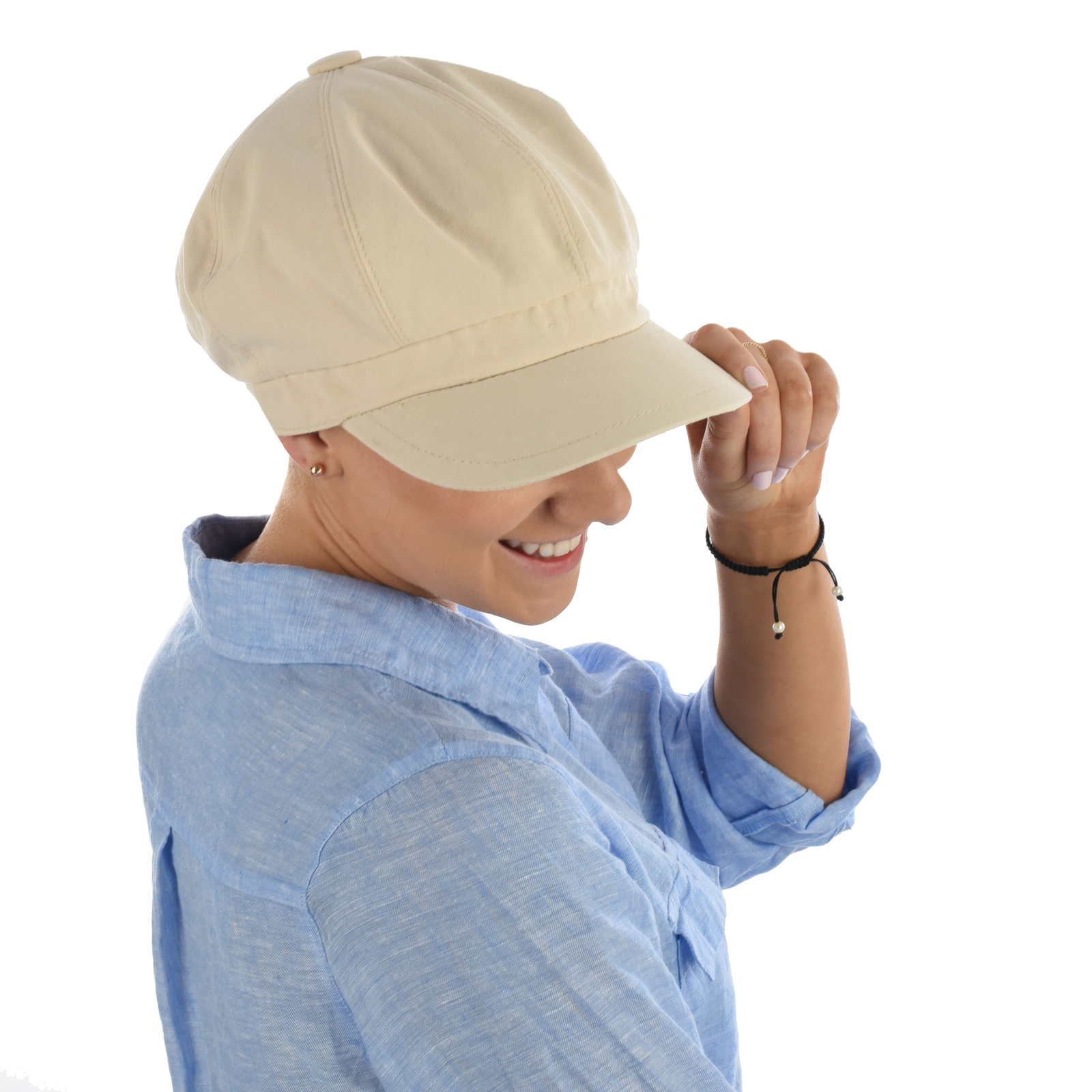 The Vivien Cotton Bakerboy Cap is ideal when worn on top of Full Closure Chemo Halo Headband with Hair Mia